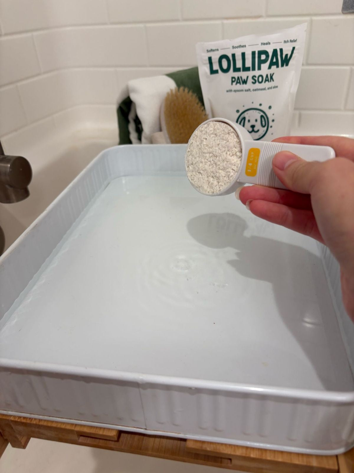 Mix 1/4 cup of Paw Soak per 1 liter of water in a container of your choice